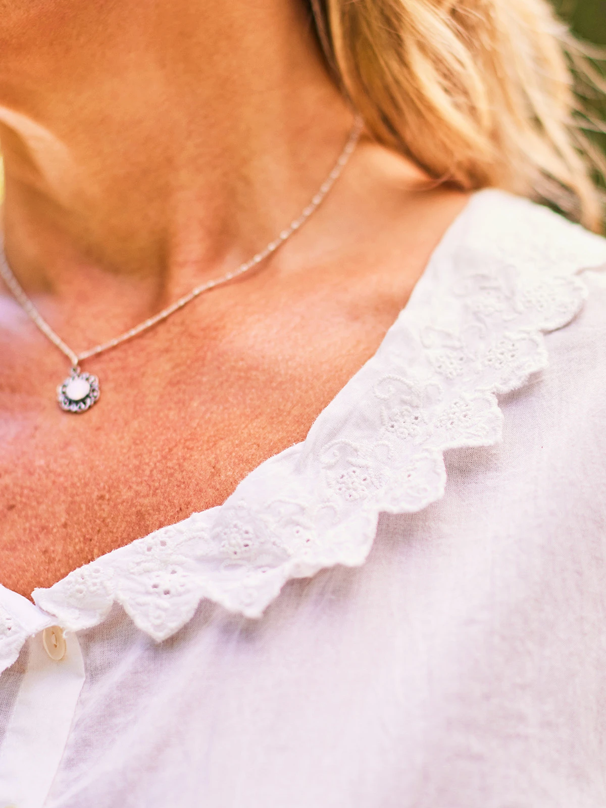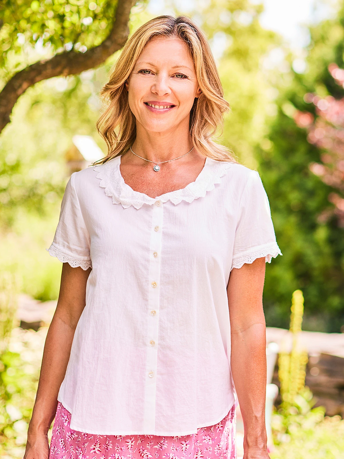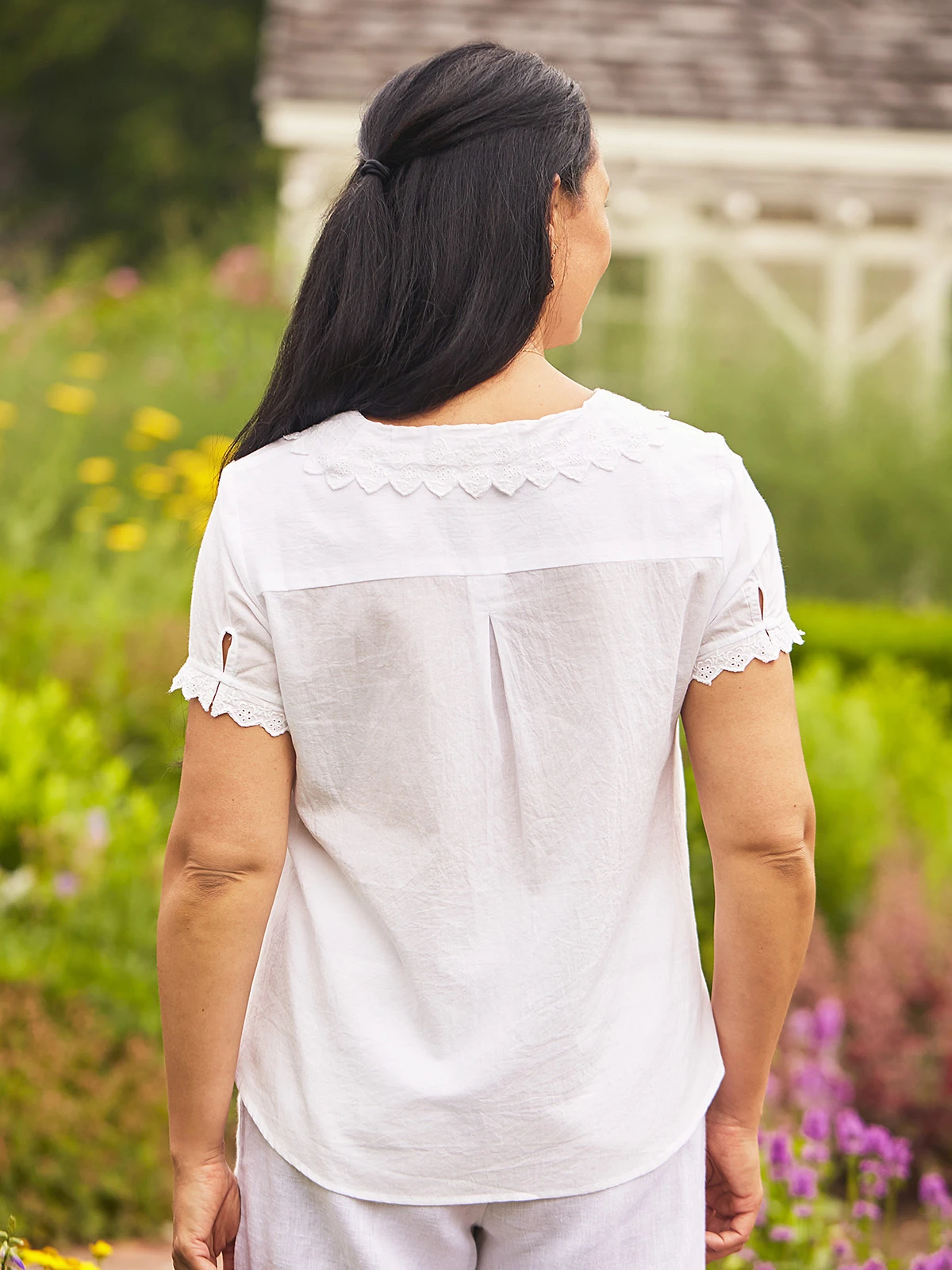 Delightful design wherein our specially curated skin soft cotton shines, the Amelia is a splendid summer top that pairs easily and always looks great! Timeless style elements include an eyelet lace collar and cuff and a flow inducing box pleat a center back.