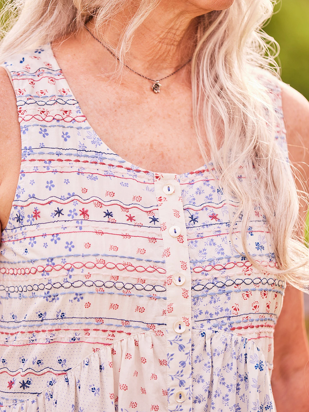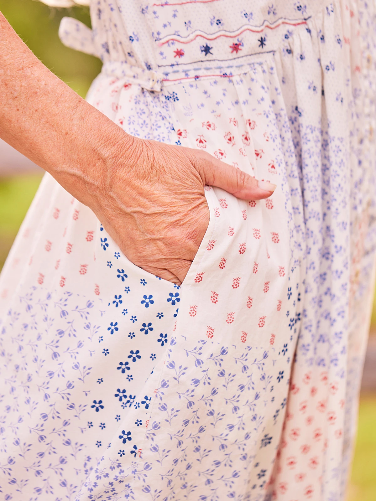 How fun! This sweet assortment of April’s petite prints on cotton is fully lined in voile and artfully embellished with whimsical embroideries, mother of pearl buttons and self fabric ties.