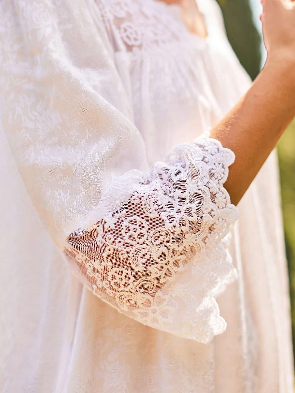 - Embroidered lace detail at yoke and sleeves
