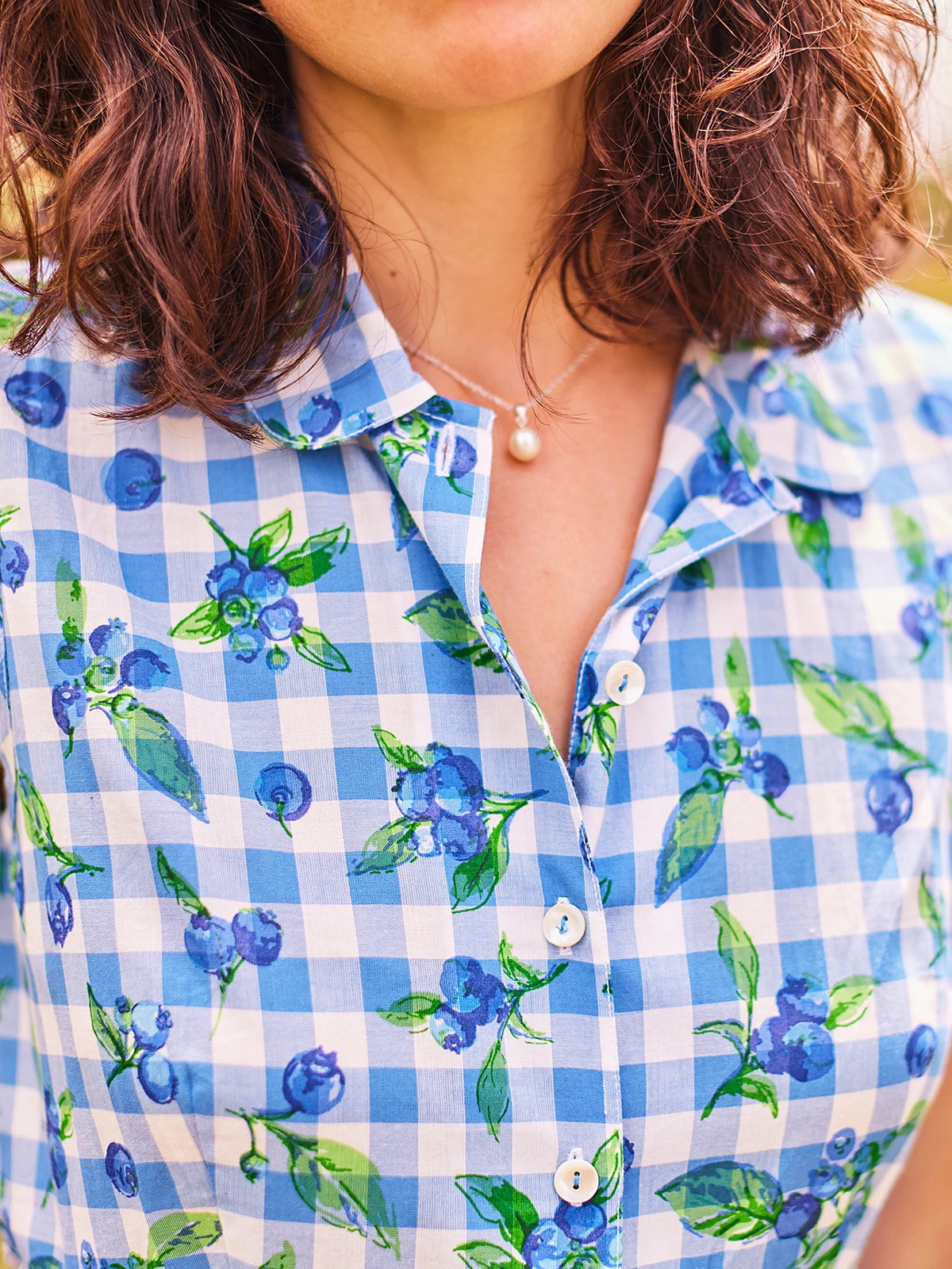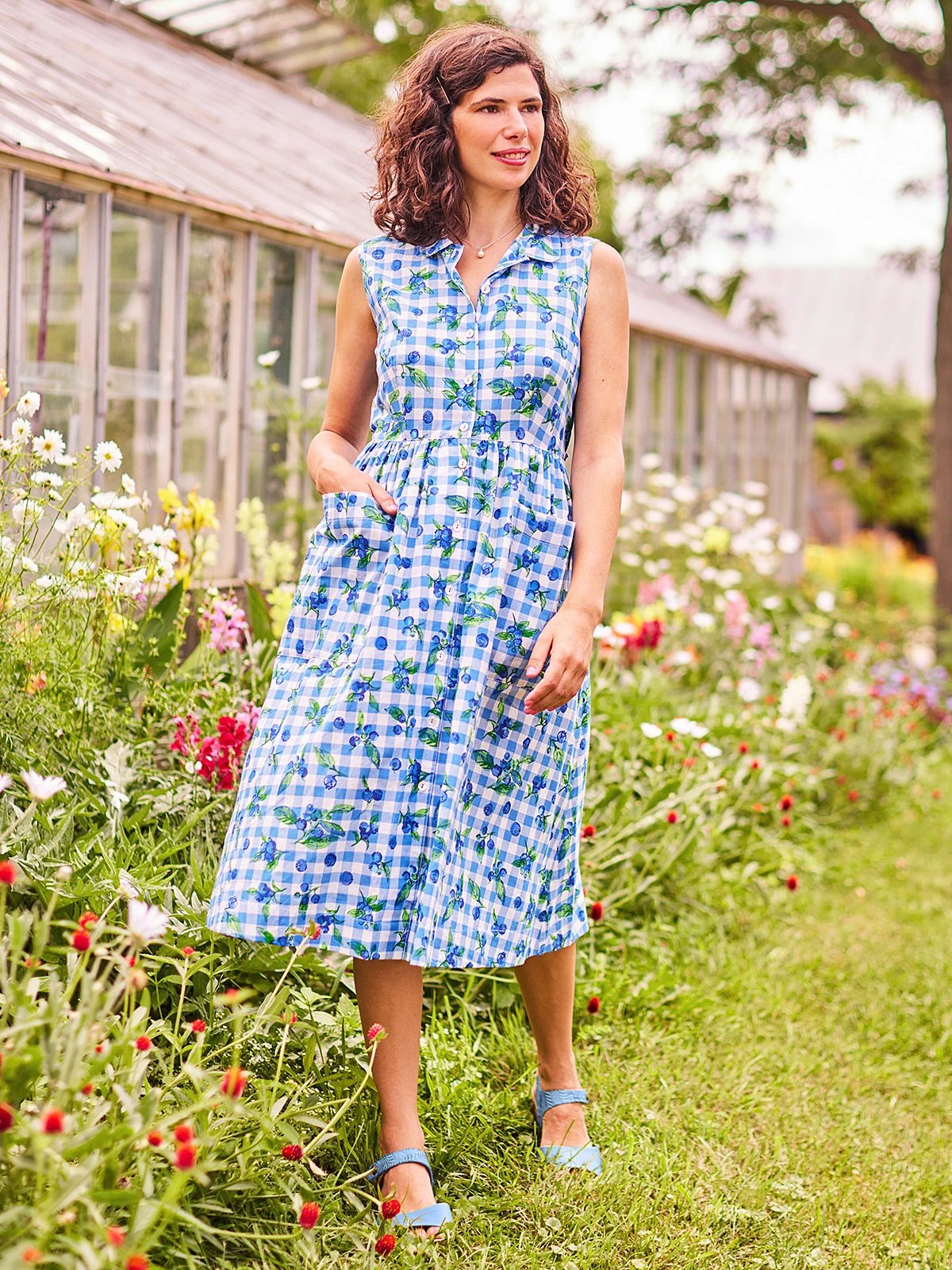 You’re going to want to gobble up April’s delicious Blueberry design printed on delectable cotton gingham check. Sweet style elements include gentle gathers, oversized patch pockets and button on ties for a custom silhouette.