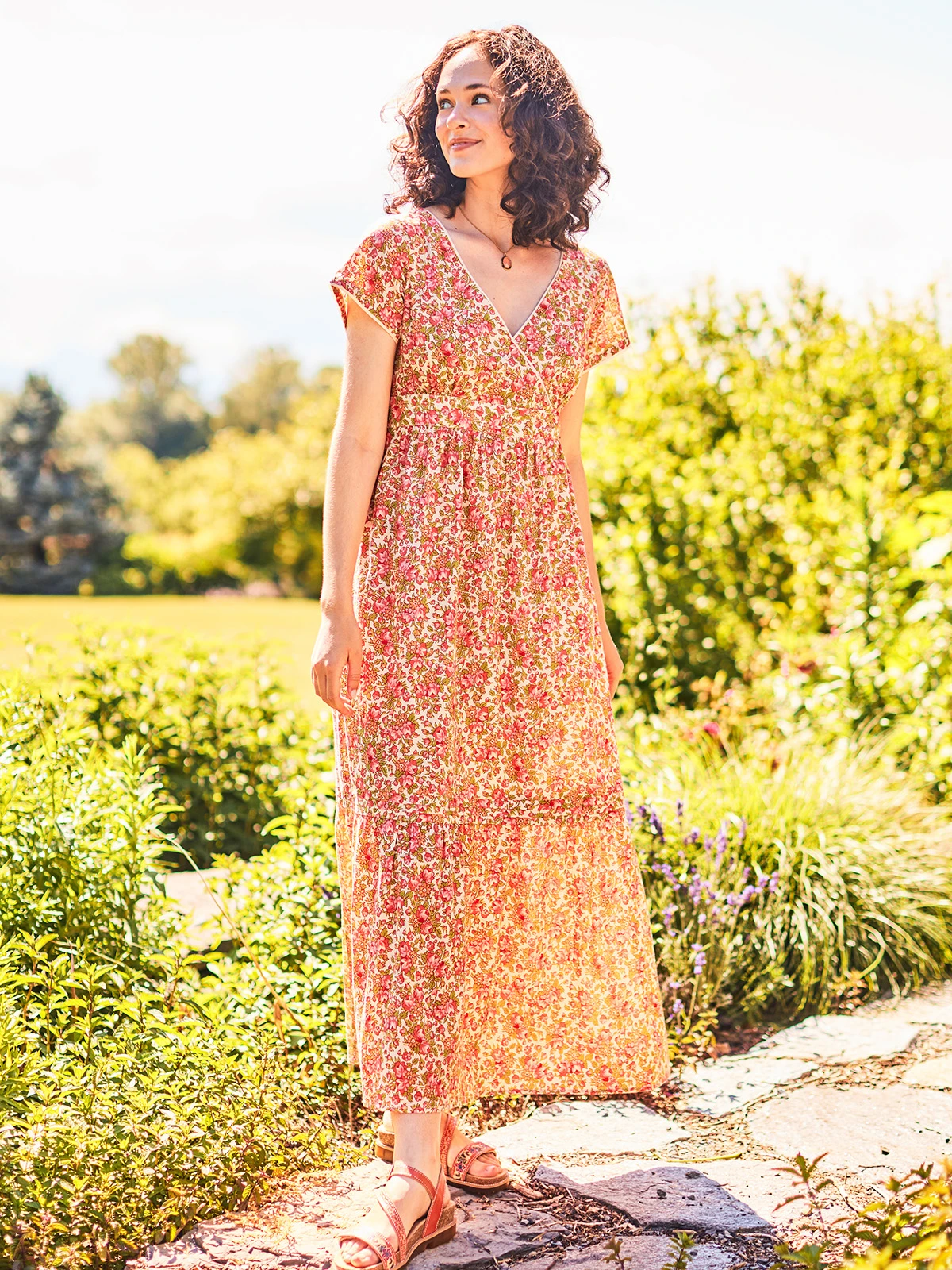 April does it again with this soothing, sumptuous print on cotton composed of pale butter, apricot, sage and coral. Signature styling defined by a wrap style bodice, flattering gathers and a flowing flounce. Fabulous.