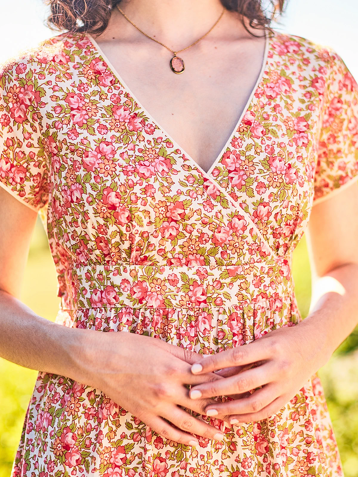 - Flattering gathers at bodice and waist