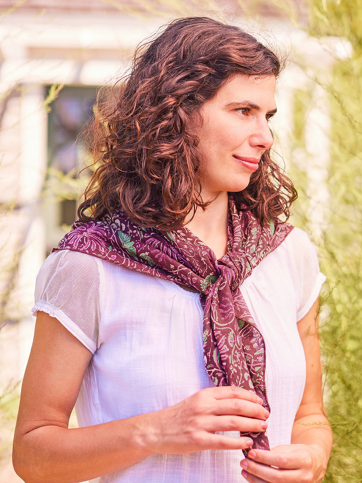 Mirror the complexity of your spirit by embracing this intriguing pattern presented in rich plums, marvelous meadow green and pale rose accents.