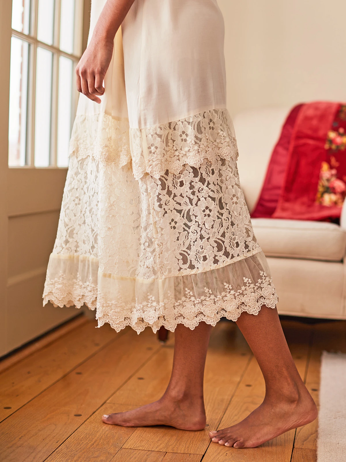 - Tiered lace and embroidered net along hem
