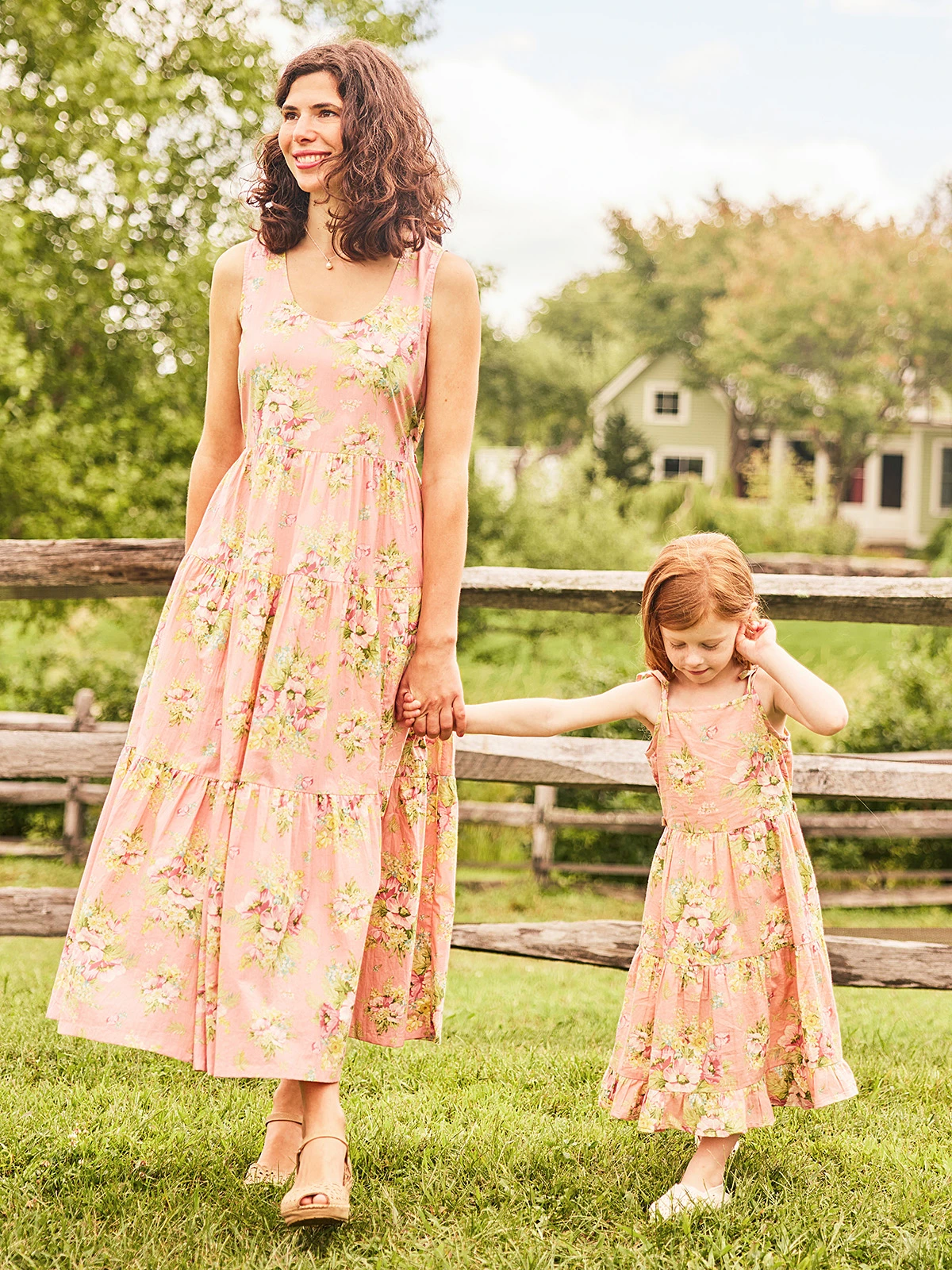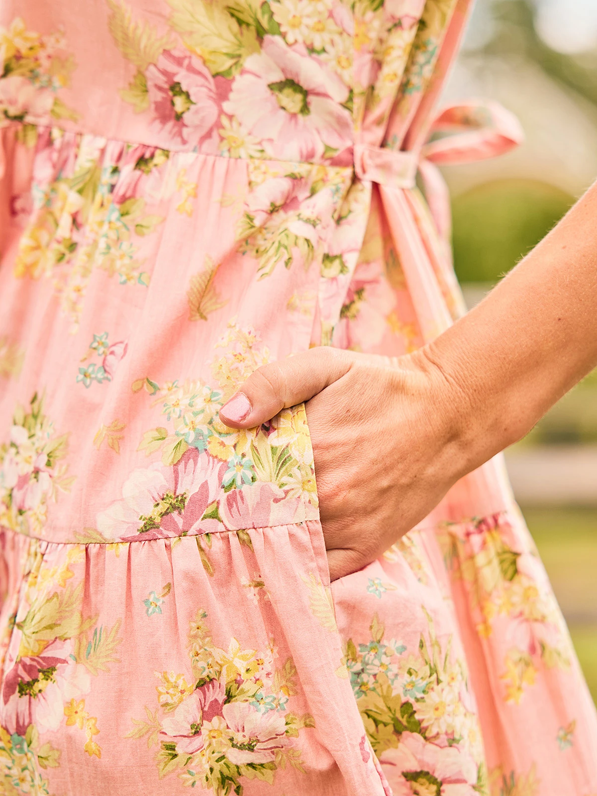 Gentle shades of coral and rose find form amongst yellowed greens and flashes of robin’s egg blue in this delectable print from the artist’s signature hand. Showcasing a tiered silhouette and thoughtfully styled with side seam pockets and button on ties for the perfect fit.