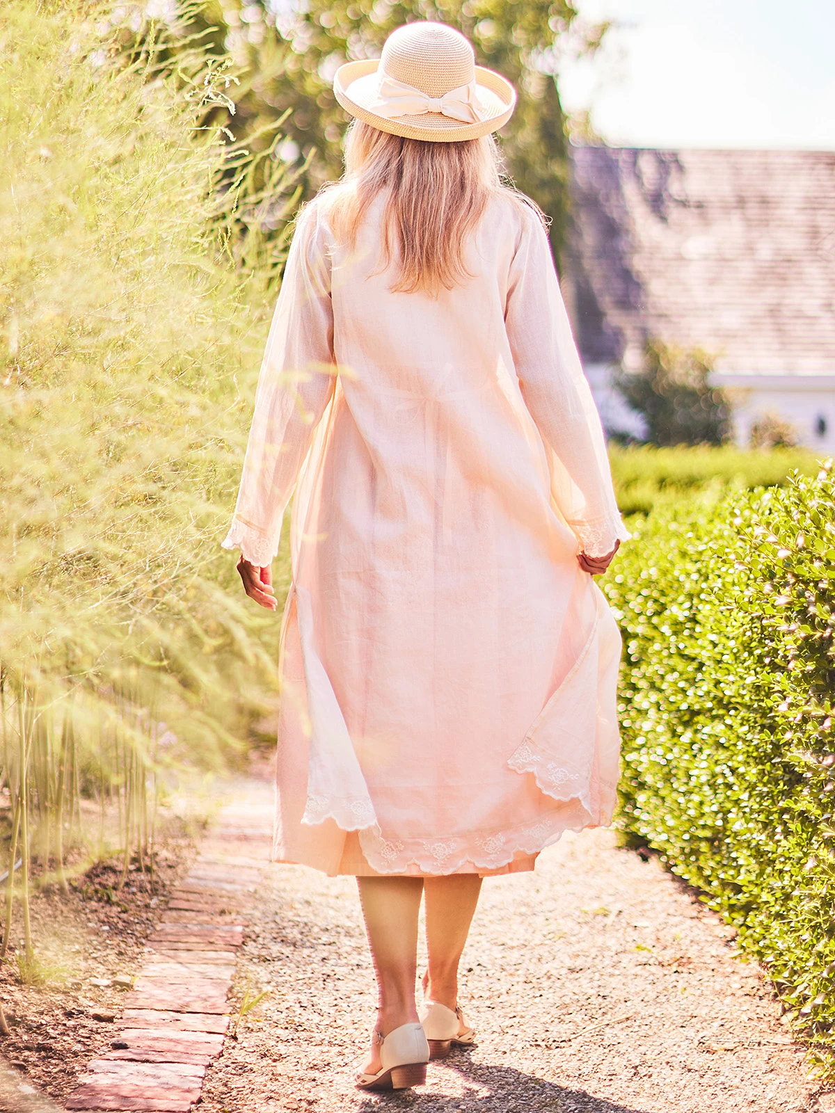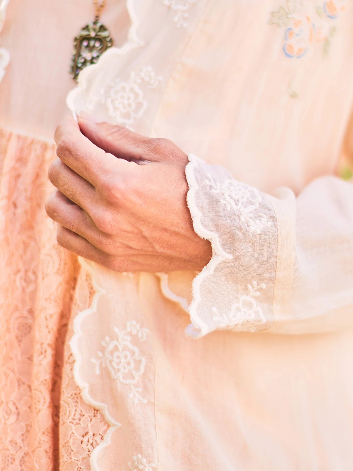 Sheer cotton organdy artfully crafted with the designers hallmark detailing. Exceptional hand guided embroidery throughout, lovely scalopped edge, generous side slits.