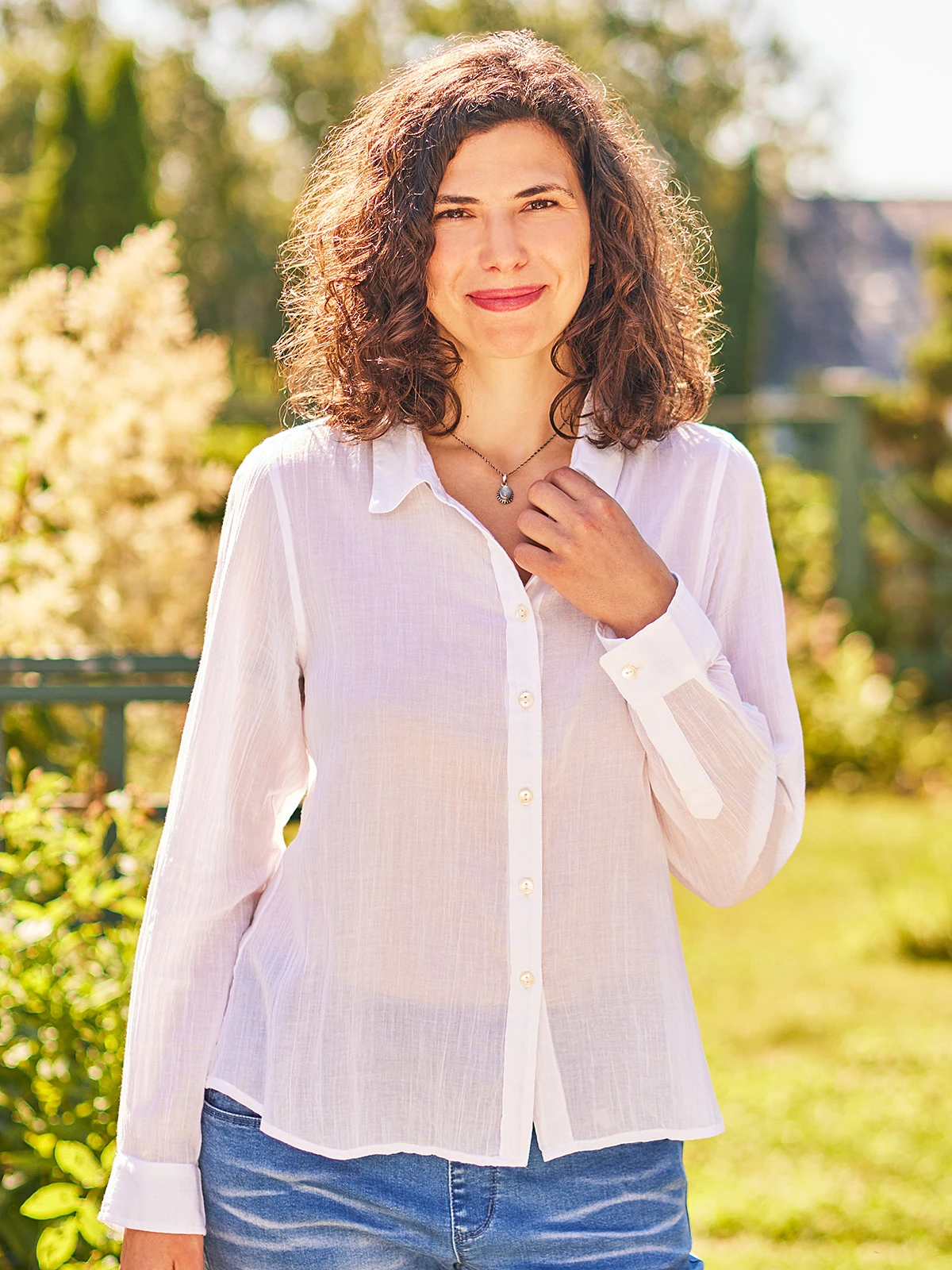 Sublime gauze weight of cotton delivered in a versatile form fashioned with natural mother of pearl buttons and flattering darts at the back.