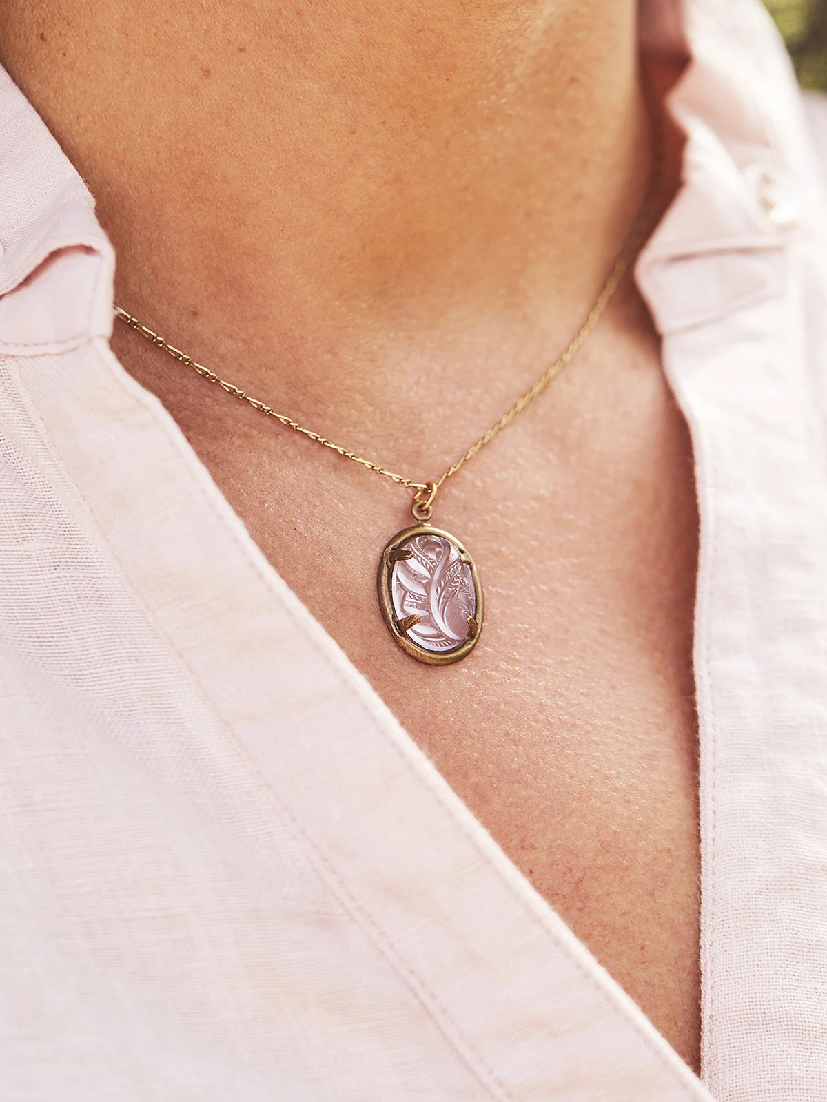 With its etched glass stone, this pendant necklace is the ultimate symbol of sophistication and timeless beauty. April is thrilled to partner with great American designers like Anne Koplik—whose vintage, heirloom inspired jewelry makes you feel beautiful inside and out.
