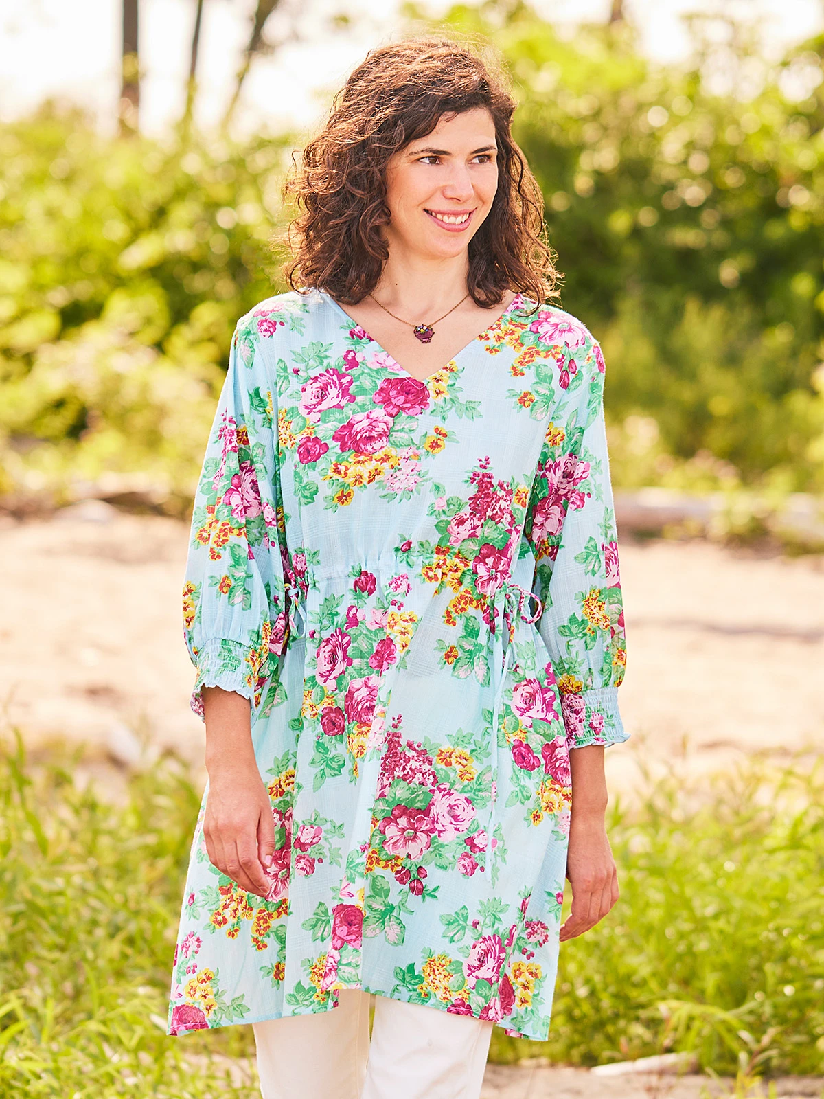 Make a splash this spring with a gorgeous aqua floral that sets your heart a fluttering! Wonderful lightweight cotton check fashioned with light ruching and drawstring ties.