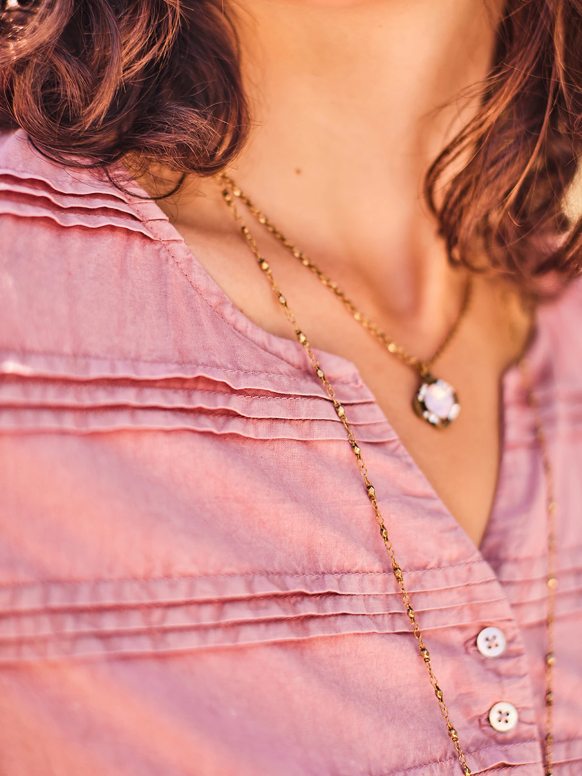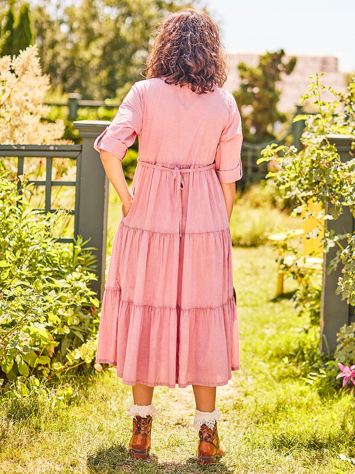 Sunwashed cotton saturated in a subtle shade of rose forms the basis of this gorgeous tiered dress featuring textured pleats on the bodice, mini mother of pearl buttons and self fabric ties. More please.