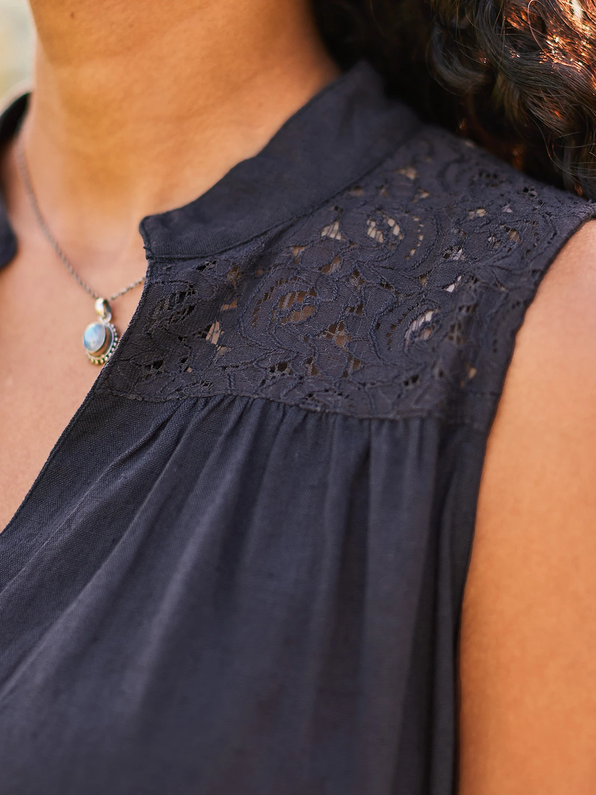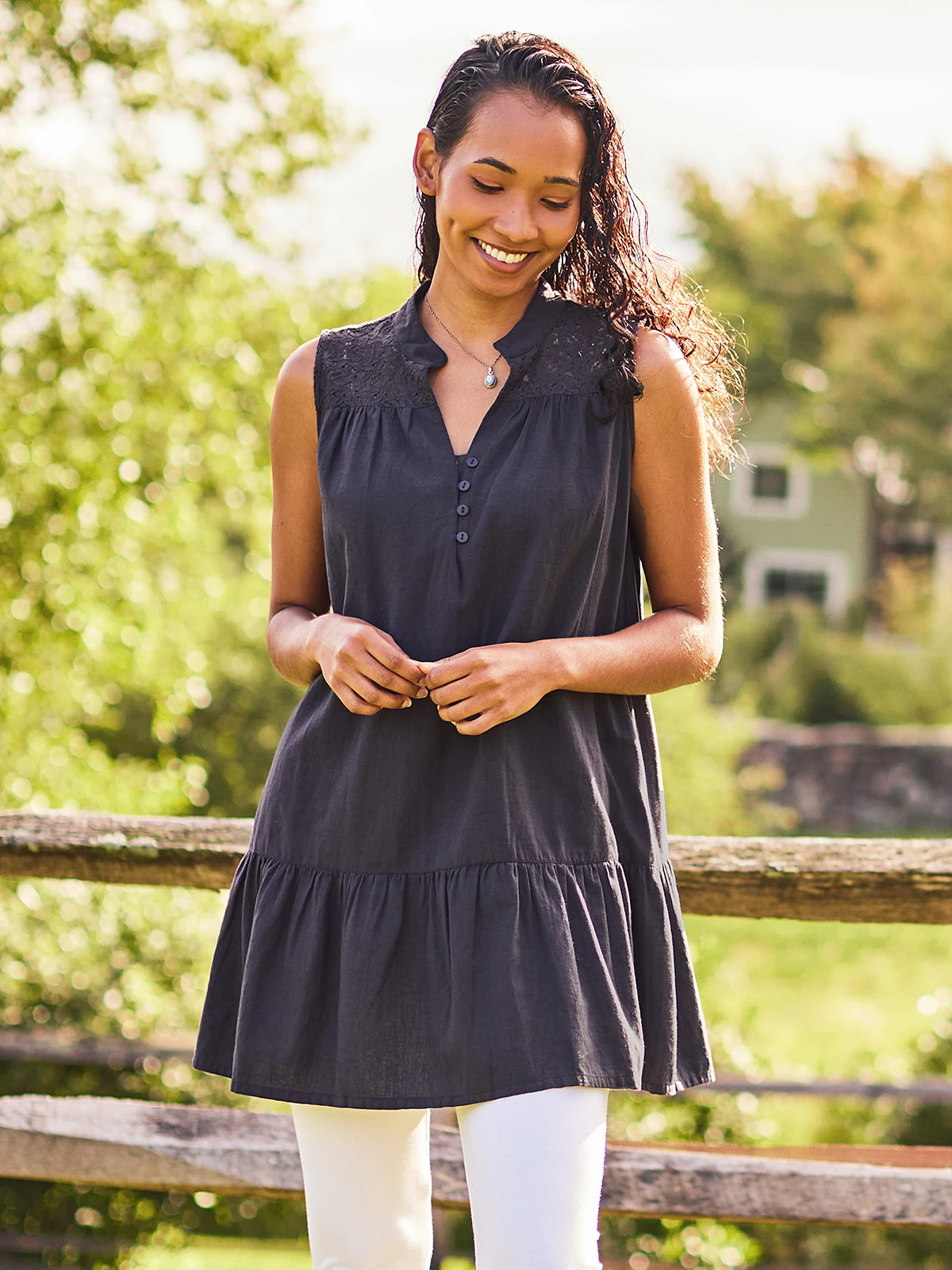Fresh and fabulous, the Fuji Tunic is a must have for go-to gorgeous all season long. Signature highlights include a pieced in lace yoke, practical side seam pockets and a twirl ready flounce.