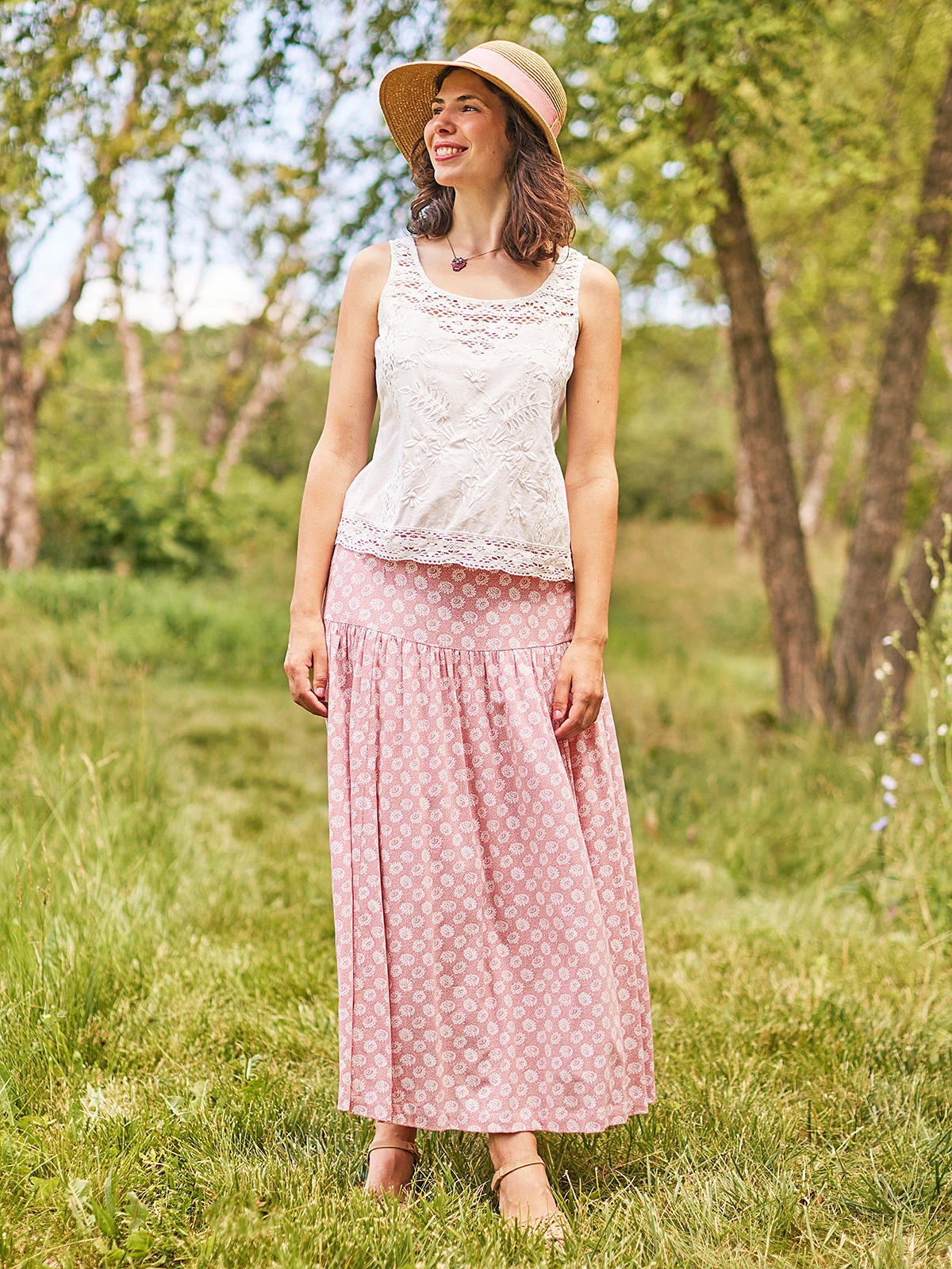 - Claire is 5’8″ and wearing a size small skirt measuring 34″