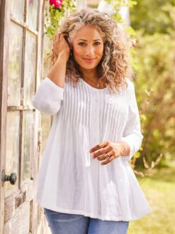 Versatile and elegant, the Hallie is crafted from lightly textured cotton and artfully styled with pretty pleats and natural mother of pearl buttons. Perfect.