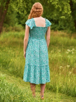 Soft shades of aqua and teal come to bloom on a field of natural white rayon in this soul soothing design for spring. Lovely hand elastic shirring on the bodice, sweet ruffles at the tiers and side seam pockets for phones and such.