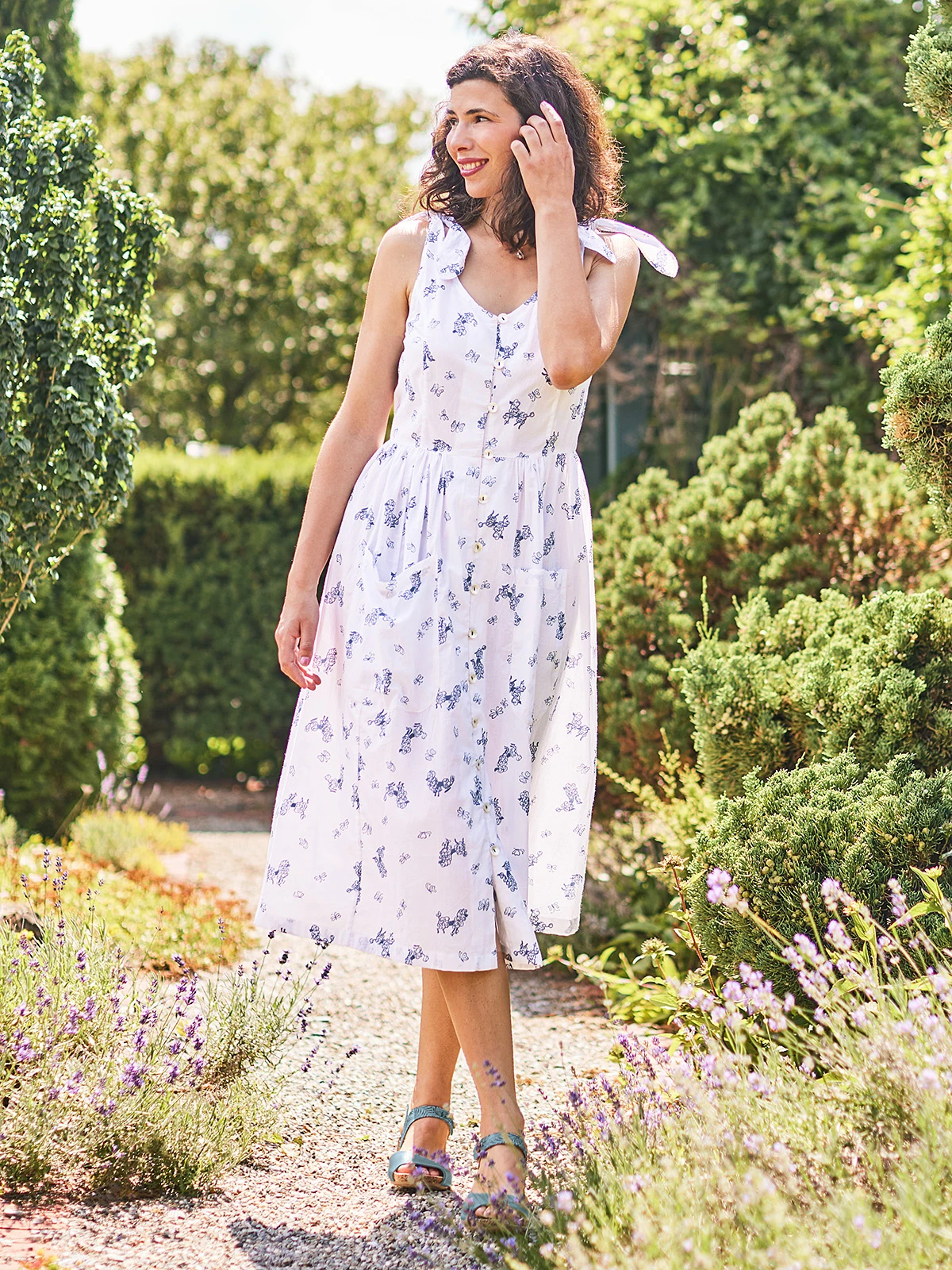 April’s très chic indigo poodles and butterflies pose for delightful effect in this deliciously fun design on cotton. Flattering princess seams, oversized patch pockets and button on ties for a custom silhouette.