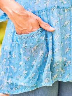 Like a sweet song for searching hearts, April’s Serenade on ethereal turquoise georgette is a balm of beauty for gentle spirits everywhere. Hand crochet trims along the collar and pockets, light gathers, natural mother of pearl buttons.