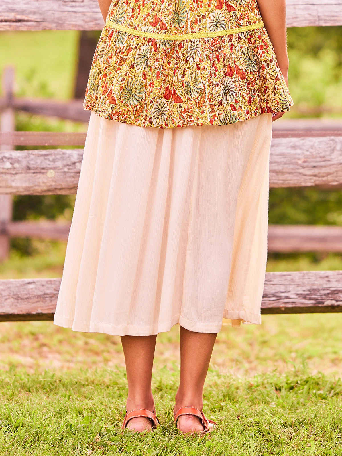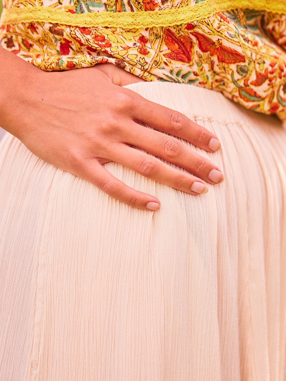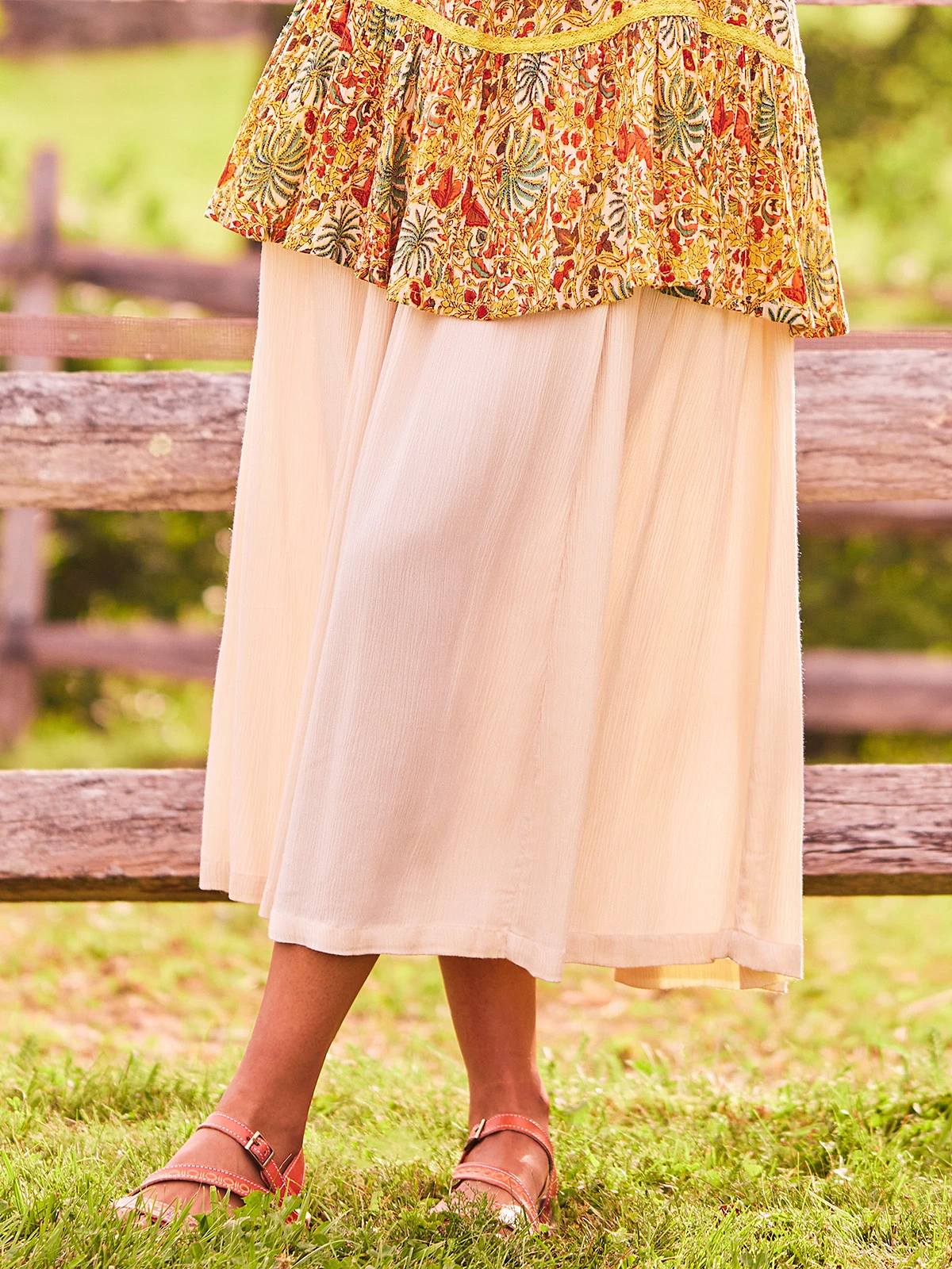 The perfect free flowing skirt for summer sojourns crafted in April’s signature rayon crepe and fashioned with a full elastic waistband.