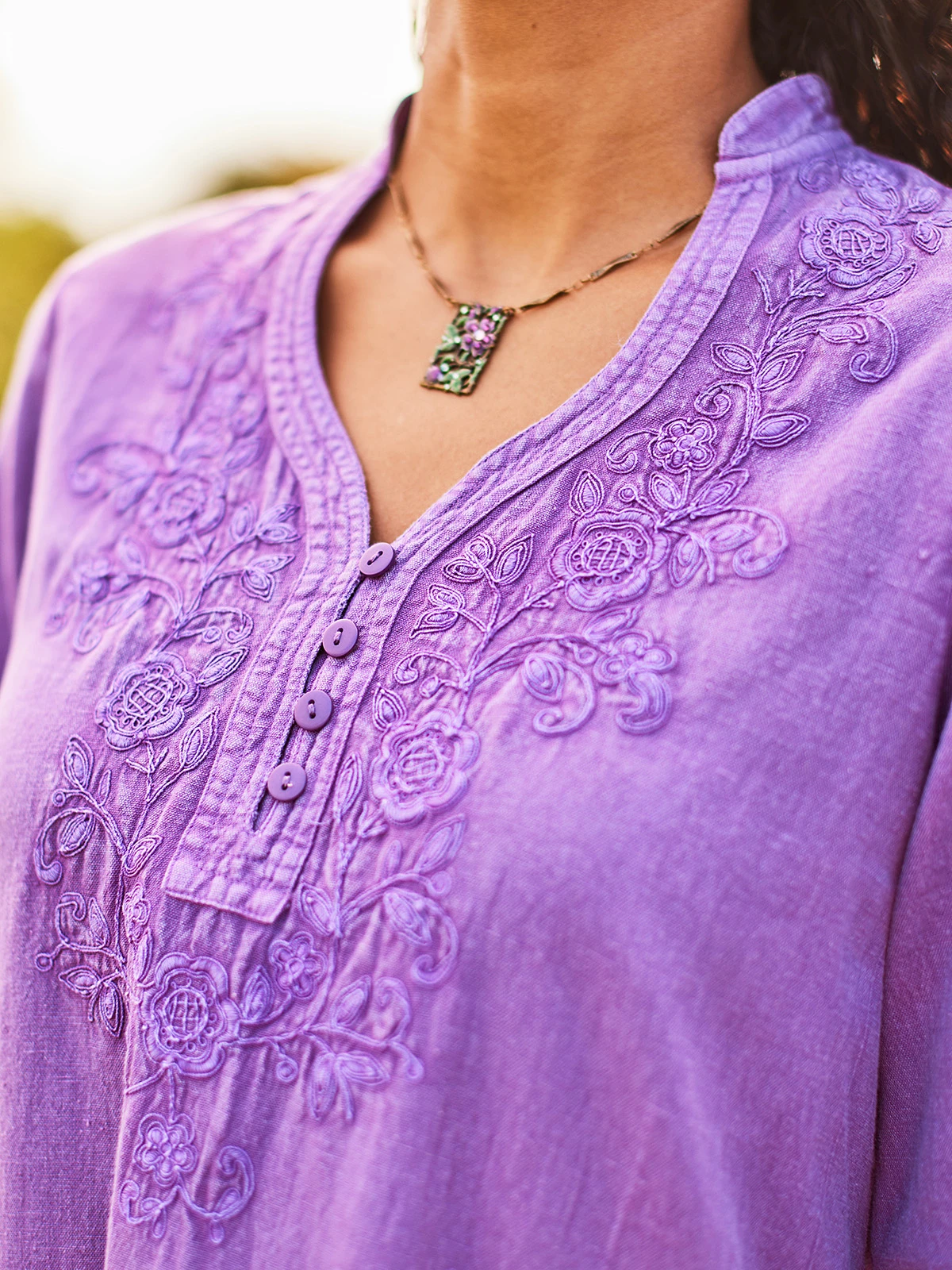 A fantastic garland of hand guided, dori style embroidery takes center stage on this daydream worthy design destined for smiling hearts and spectacular summer days.