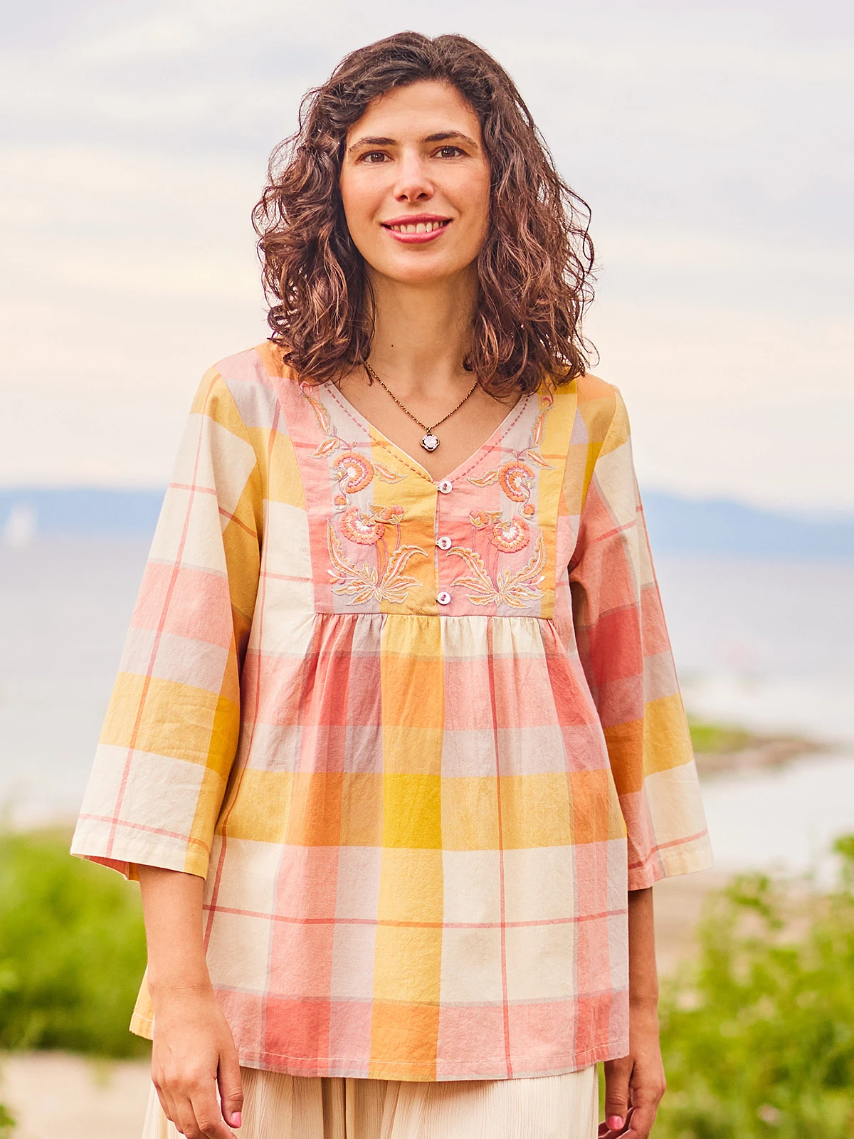 Sumptuously soft coloration on cotton artfully adorned with hand guided embroideries, gentle gathers and natural mother of pearl buttons.