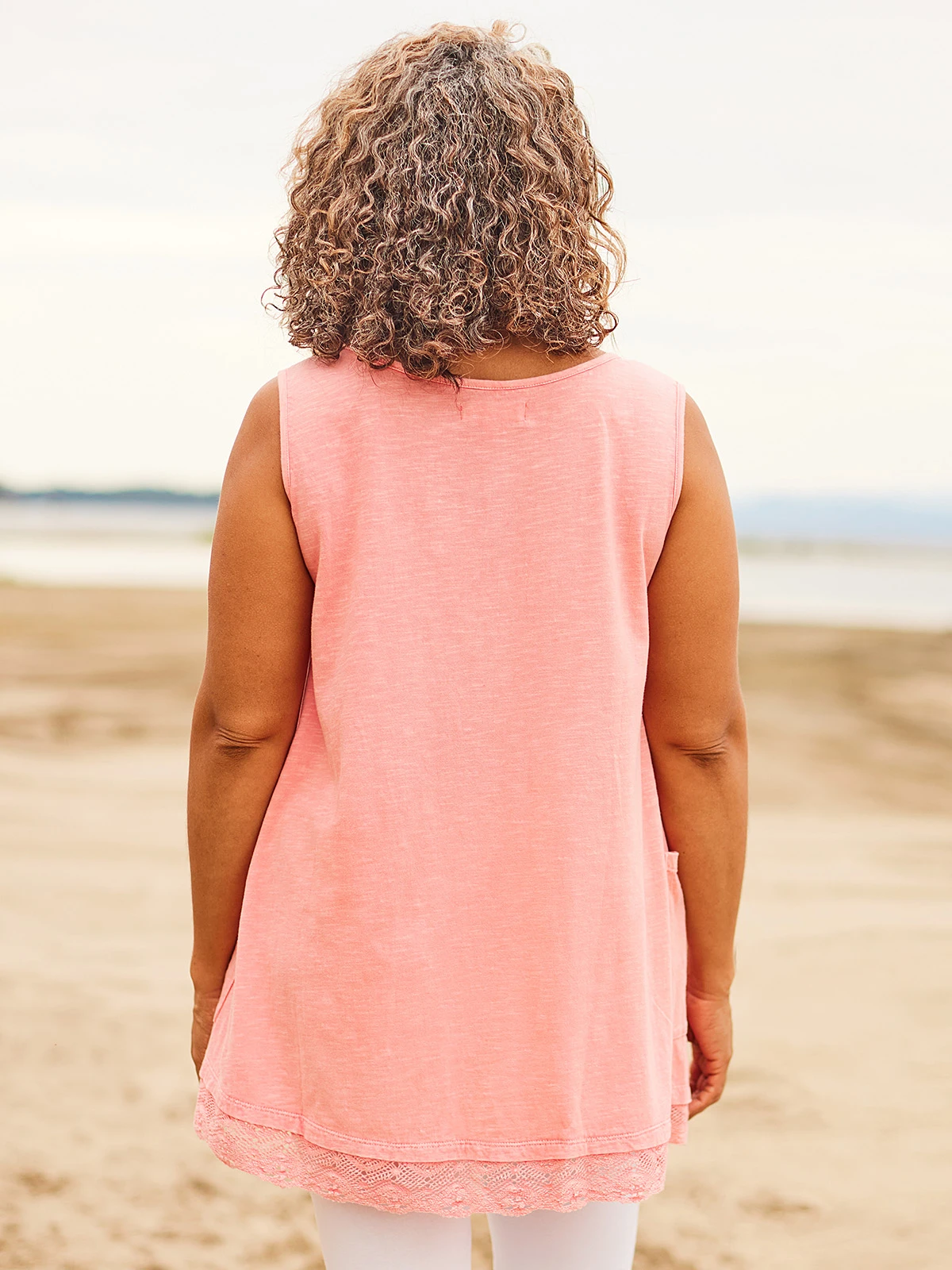Casual comfort with a dash of elegance! Lovely sunwashed cotton jersey marked by magnificent drape and delicious feel with a gorgeous lace hem and practical patch pockets.
