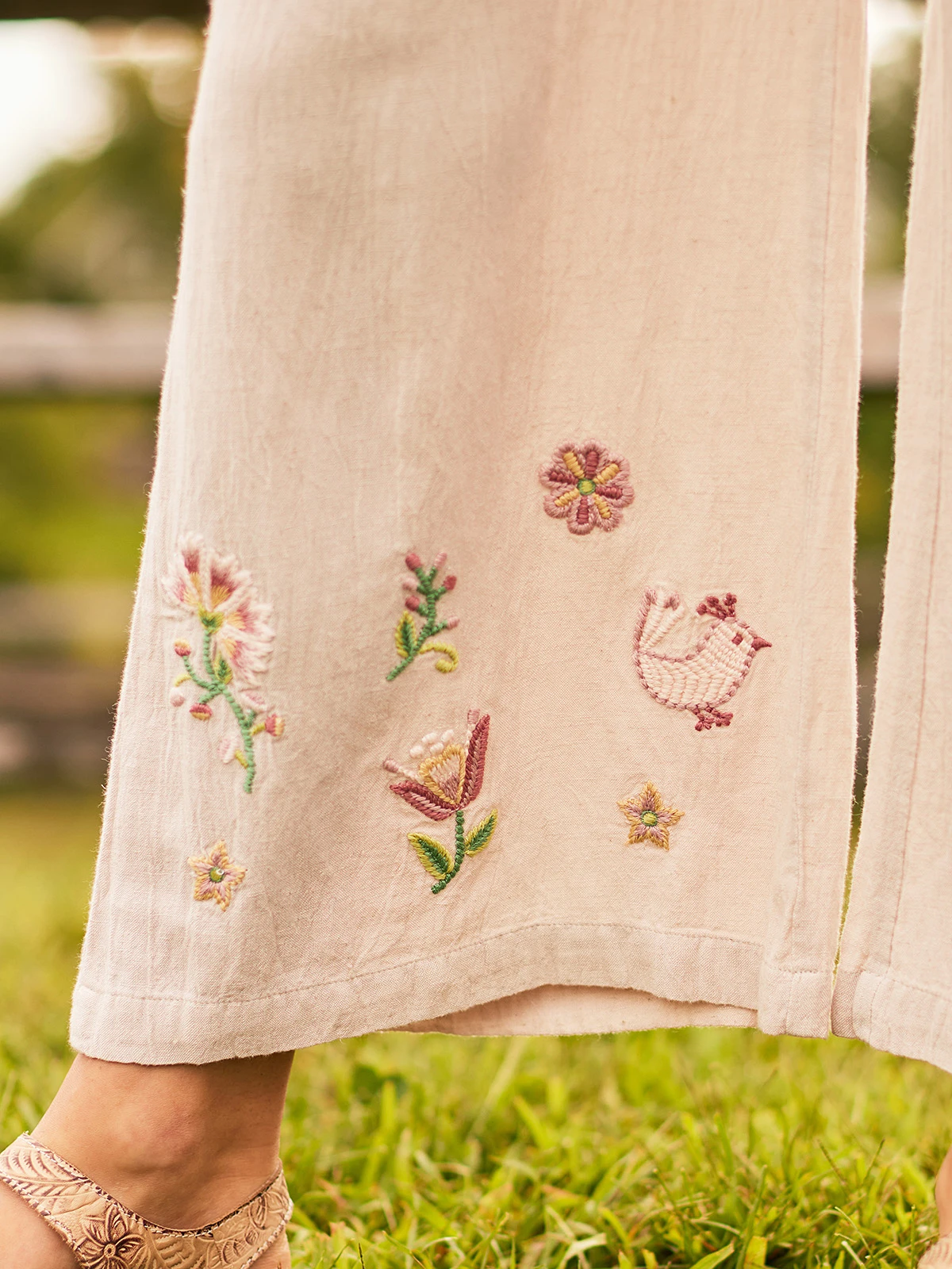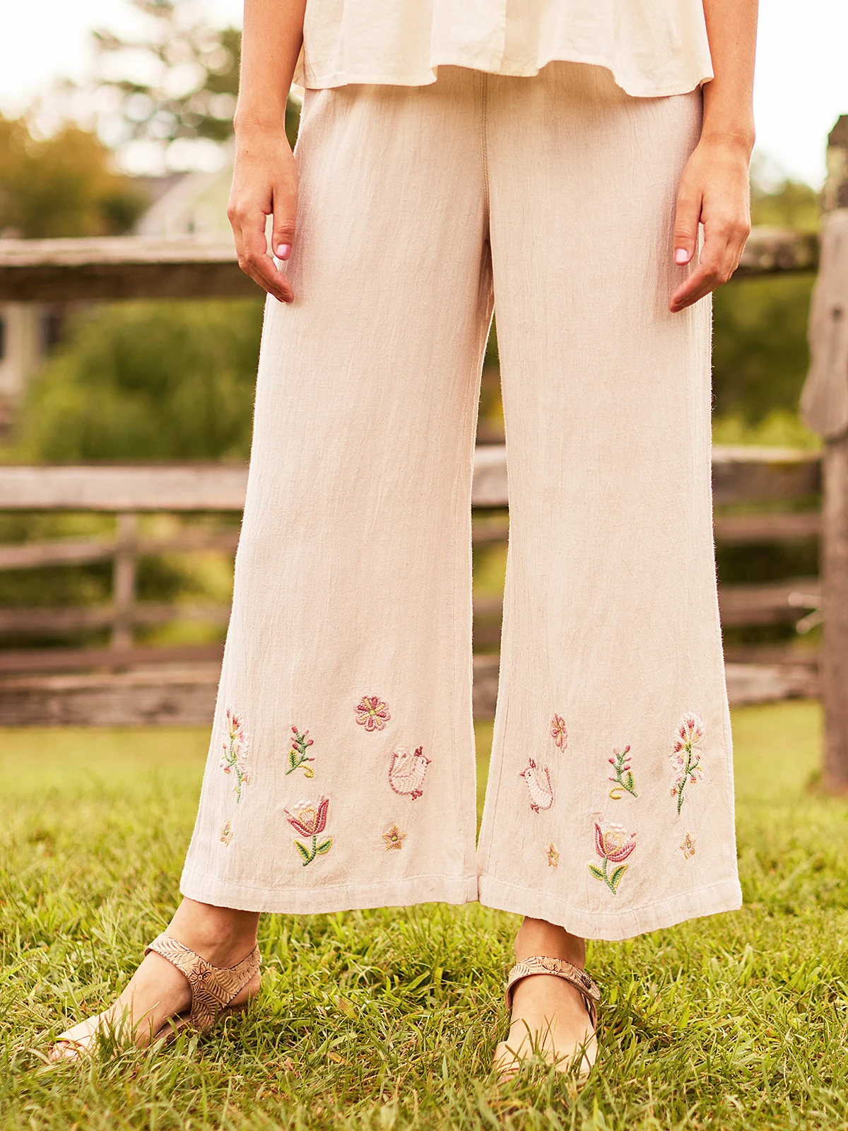 Gorgeous whimsical embroideries highlight our most fabulous pant for the season! Back patch pockets, comfy elastic waistband.